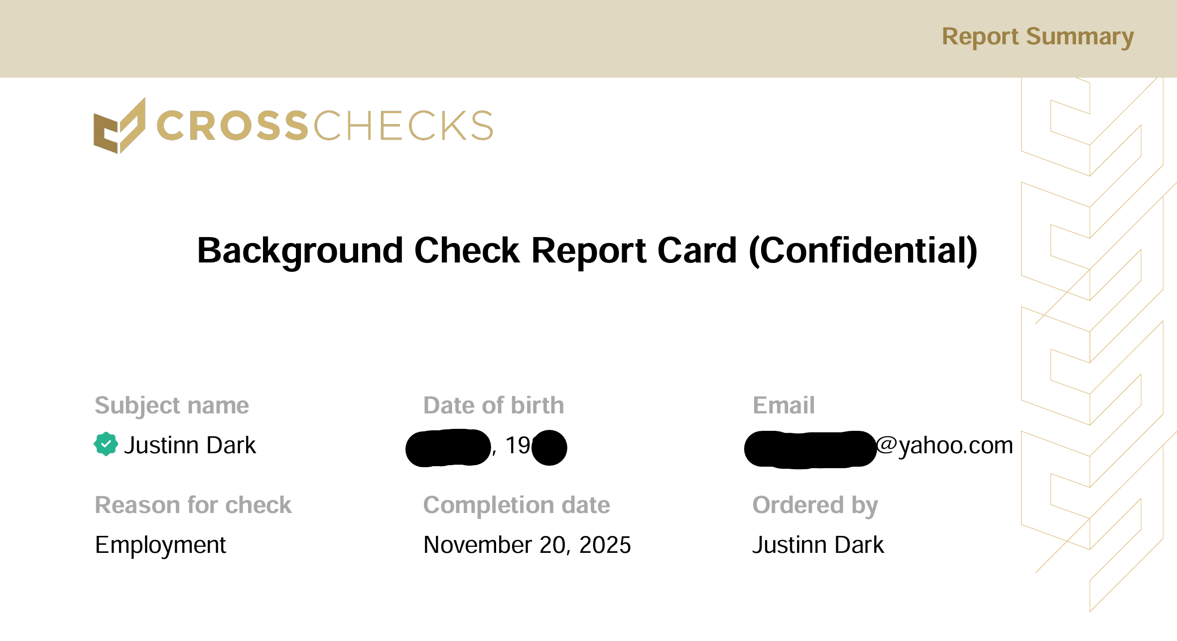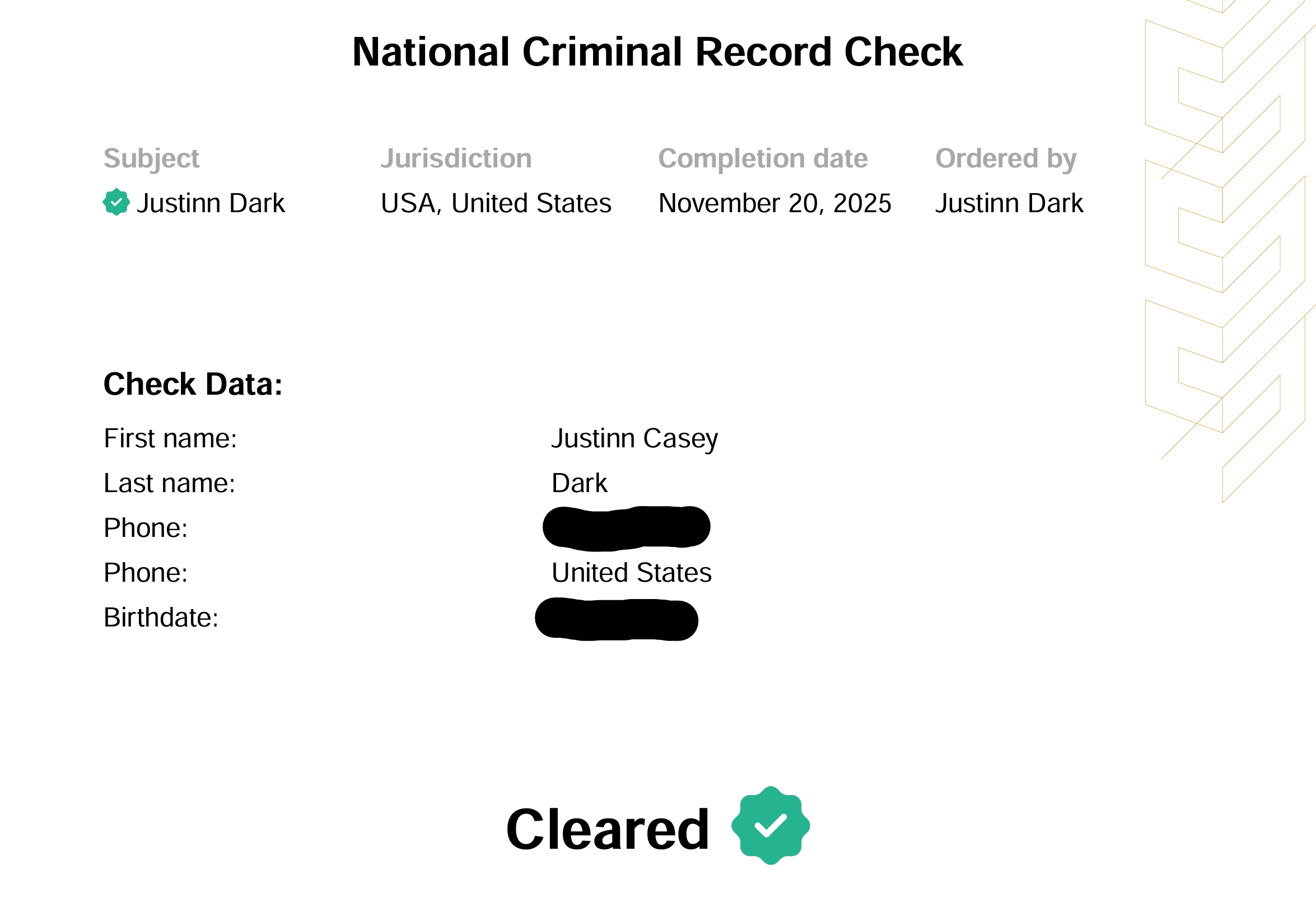 Here is my National Background Check (redacted). You will see that my first name is Justinn, but I go by my middle name Casey… the cat is out of the bag!